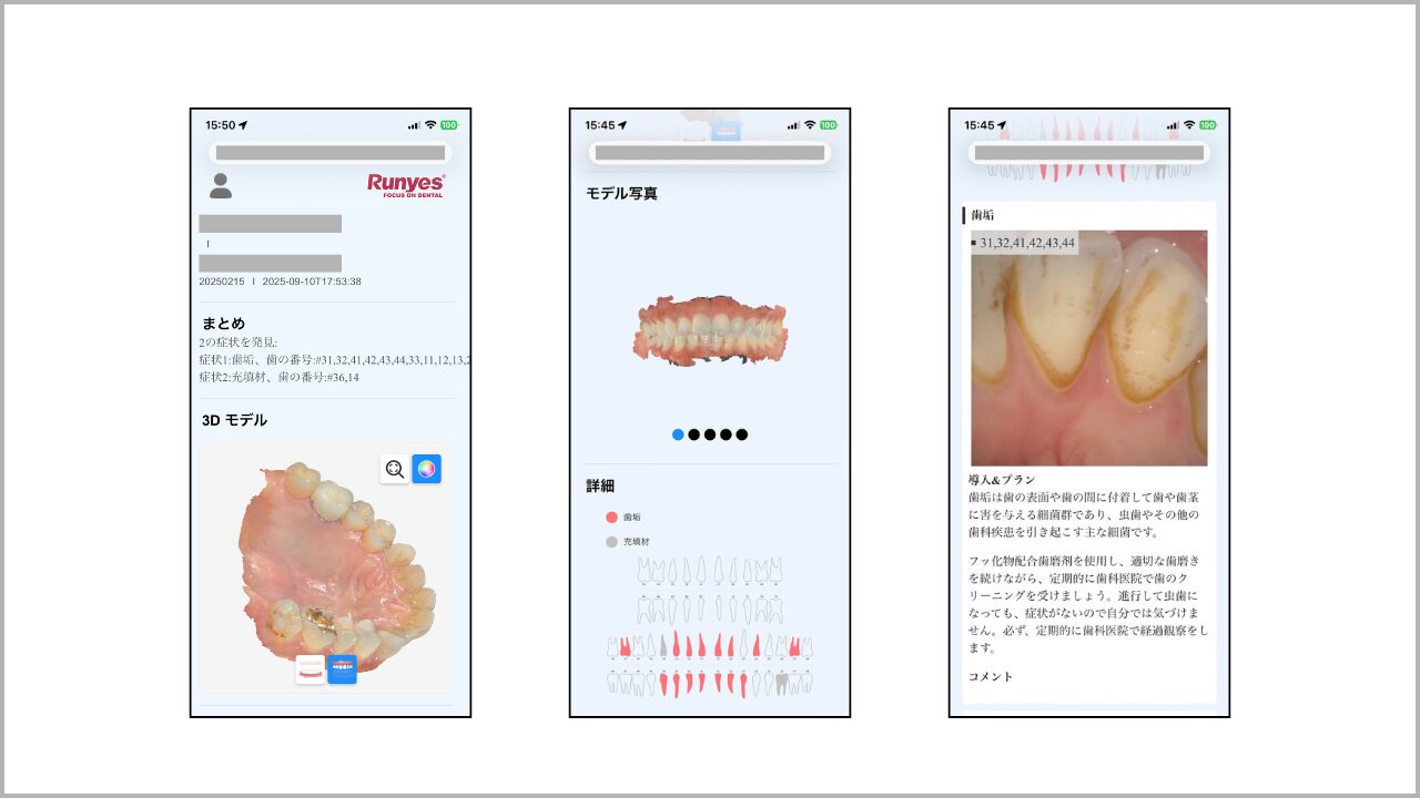 古田院長:Runyesを導入した最大の理由は、「データの保存とコンサルの入口」としての活用です。 例えば小児歯科の場合、RunyesのAIレポート(口腔健康レポート)をスマホで保護者にポッと渡すことができます。レントゲンの写真なんかもそうですが、今の患者さんは「自分のデータをスマホで手元に欲しい」と望んでいると思うんです。
