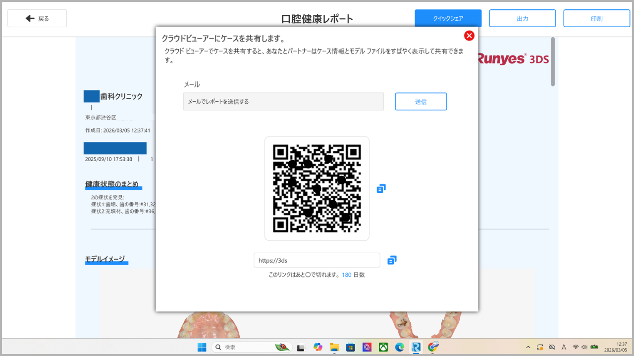 どんなに素晴らしいレポート機能でも、作成に時間がかかっていては忙しい現場では使えません。RunyesのAIレポートは、その「手軽さ」と「スピード」が群を抜いています。スキャン完了後、画面上の【レポート出力】→【クイックシェア】を押すだけ。なんと「3クリック、たったの10秒※」で、患者様のスマホに読み込ませるためのQRコードが生成されます。(※インターネット環境により変動します) チェアサイドでの会話を途切れさせることなく、瞬時に次世代のコンサルテーションへと移行できるのは、非常に大きなメリットです。